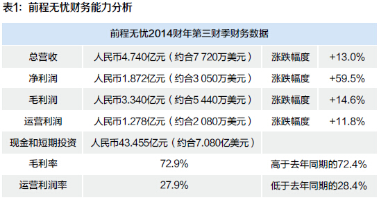 时至今日,其财务依旧可观。前程无忧财务数据显示,在截至2014年9月30日的第三季度,前程无忧总营收为人民币4.740亿元(约合7 720万美元),同比增长13.0%;净利润为人民币1.872亿元(约合3 050万美元),比去年同期的净利润人民币1.174亿元增长59.5%(如表1)。无论是营收还是现金流,在人力资源行业来说,前程无忧业绩遥遥领先。前程无忧的财务数据实则“无忧”。