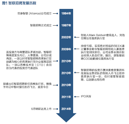 业内人称,智联招聘基本见证了中国互联网招聘业务所有走过的历史,它成立于1997年,前身是1994年创建的猎头公司智联 (Alliance)公司,但一路发展一路曲折。(如图1)