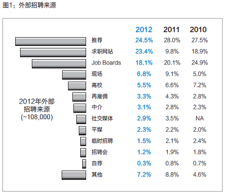 据CareerXroads一年一度的《Source of Hire Report》(2013)显示,在美国Job Boards并非大家人云亦云的“毫无生机”或是“一无是处”,而美国的在线招聘市场并不仅仅是当前炒的火热的LinkedIn的天下。相反,在大数据、移动化的浪潮下,它依旧活跃并进化着(如图)。