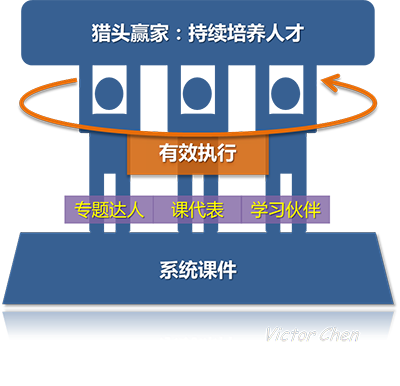 希望以上的说明能让大家对“生态培训体系”这个概念有了更直观的了解。大家今后在公司中都能看到这样的一个生动的画面(如图):“三人行”的小伙伴们踏在“系统课件”坚实的基础上,“有效执行”是环绕彼此的纽带,大家一起能协力托举起作为“猎头赢家”的公司品牌 ,因为小伙伴们在这样教学相长的环境下已经成为人才了。